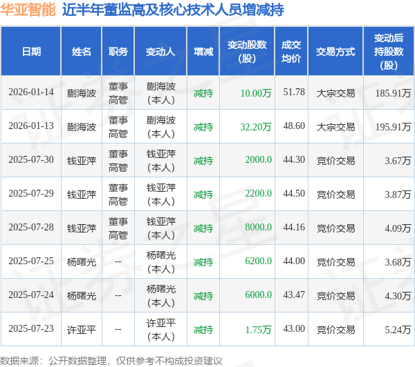 华亚智能近半年内的董监高及核心技术人员增减持详情如下: