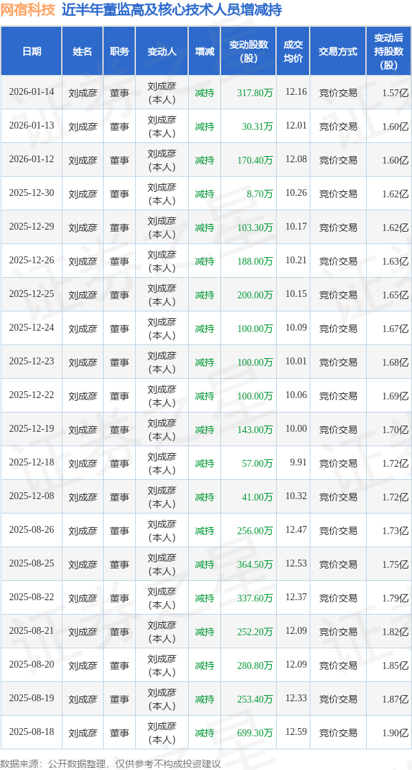 网宿科技近半年内的董监高及核心技术人员增减持详情如下: