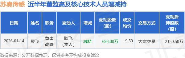 证券之星消息,根据1月15日市场公开信息、上市公司公告及交易所披露数据整理,苏奥传感(300507)最新董监高及相关人员股份变动情况:2026年1月14日公司董事,高管滕飞共减持公司股份693.0万股,占公司总股本为0.8656%。变动期间公司股价上涨0.31%,1月14日当日收盘报9.71元。