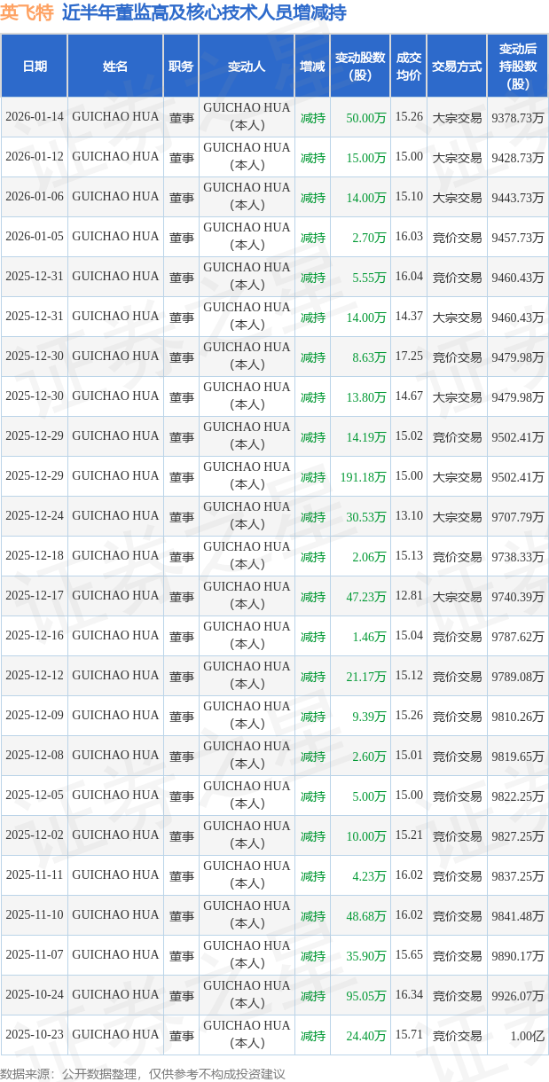 英飞特近半年内的董监高及核心技术人员增减持详情如下: