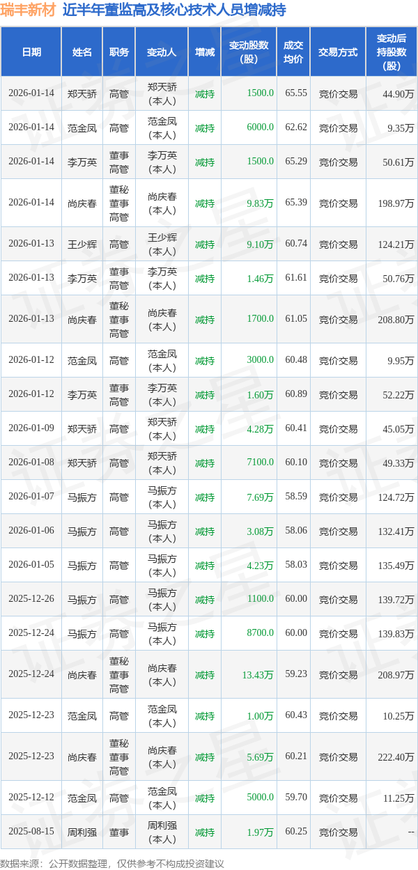 瑞丰新材近半年内的董监高及核心技术人员增减持详情如下: