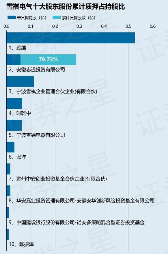 截止本公告日,股东安徽志道投资有限公司已累计质押股份2282.0万股,占其持股总数的79.73%。本次质押后雪祺电气十大股东的累计质押股份占持股比例(占持股比例的计算以公司最新一期财务报表公布的十大股东的持股总数为基准)见下图: