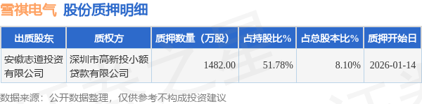 证券之星消息,雪祺电气(001387)1月16日公开信息显示,股东安徽志道投资有限公司向深圳市高新投小额贷款有限公司合计质押1482.0万股,占总股本8.1%。质押详情见下表: