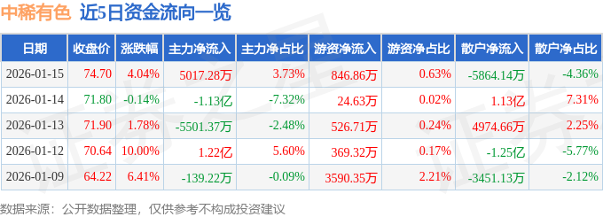 证券之星消息,截至2026年1月15日收盘,中稀有色(600259)报收于74.7元,上涨4.04%,换手率5.33%,成交量17.92万手,成交额13.46亿元。