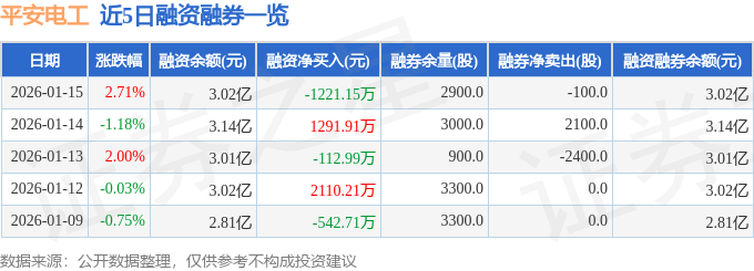 平安电工融资融券信息显示,融资方面,当日融资买入2755.35万元,融资偿还3976.5万元,融资净偿还1221.15万元。融券方面,融券卖出0.0股,融券偿还100.0股,融券余量2900.0股,融券余额20.99万元。融资融券余额3.02亿元。