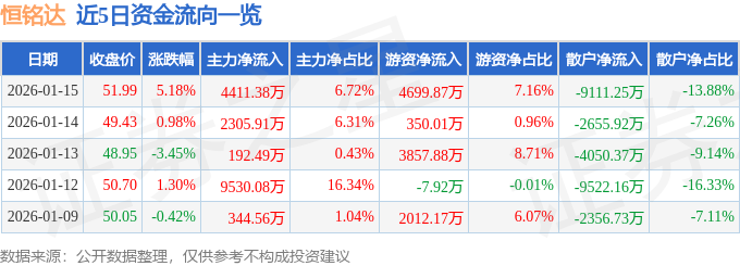 证券之星消息,截至2026年1月15日收盘,恒铭达(002947)报收于51.99元,上涨5.18%,换手率6.66%,成交量12.84万手,成交额6.56亿元。