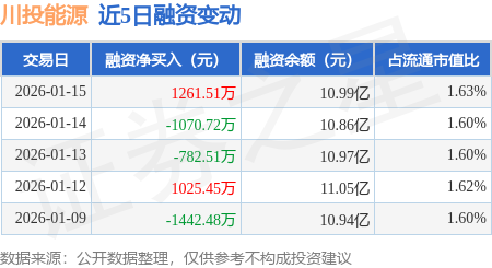 证券之星消息,1月15日,川投能源(600674)融资买入3926.37万元,融资偿还2664.87万元,融资净买入1261.51万元,融资余额10.99亿元,近20个交易日中有11个交易日出现融资净买入。
