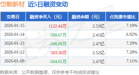 证券之星消息,1月15日,岱勒新材(300700)融资买入3010.15万元,融资偿还1887.72万元,融资净买入1122.44万元,融资余额2.53亿元。