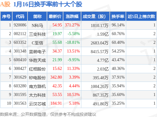 当日A股换手率前10大个股中7只个股收涨,平均涨幅59.95%,其中N科马(920086)以换手率96.14%排第一,5只个股近5个交易日中多次上榜。