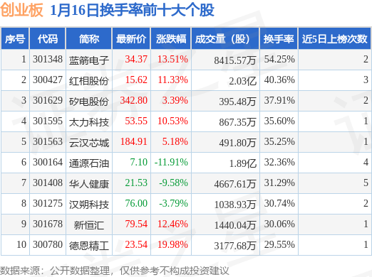 当日创业板换手率前10大个股中7只个股收涨,平均涨幅10.91%,其中蓝箭电子(301348)以换手率54.25%排第一,6只个股近5个交易日中多次上榜。