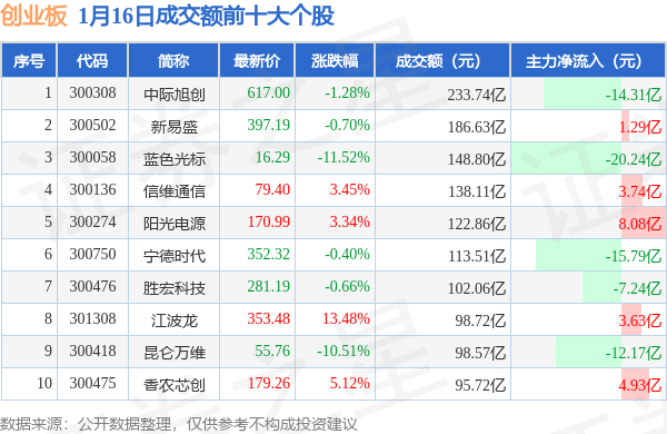 当日创业板成交额前10大个股中4只个股收涨,平均涨幅6.35%,其中中际旭创(300308)以成交额233.74亿元排第一。从主力资金流入看,成交额前10大个股中有5只个股呈现主力资金净流入。