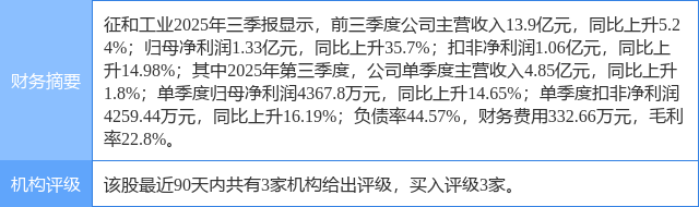 2025年11月17日,中邮证券研究员刘卓,陈基赟发布了对征和工业的研报《业绩稳健增长,布局微型链式灵巧手》,该研报对征和工业给出“买入”评级。研报中预计公司2025-2027年营收分别为19.86、22.51、25.24亿元,同比增速分别为8.22%、13.35%、12.14%;归母净利润分别为1.70、1.97、2.44亿元,同比增速分别为30.10%、15.71%、23.55%。公司2025-2027年业绩对应PE估值分别为32.79、28.33、22.93,维持“买入”评级。证券之星数据中心根据近三年发布的研报数据计算,该研报作者对此股的盈利预测准确度为59.41%。