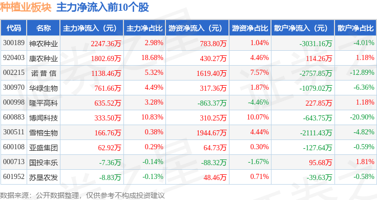 从资金流向上来看,当日种植业板块主力资金净流出8318.76万元,游资资金净流入1.32亿元,散户资金净流出4915.25万元。种植业板块个股资金流向见下表: