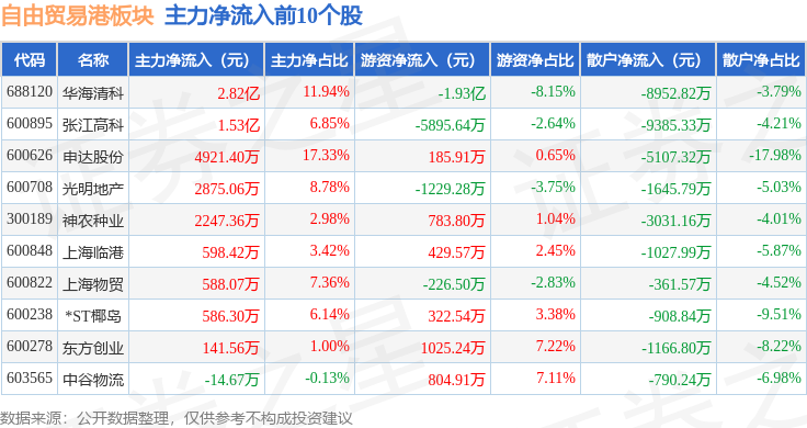 从资金流向上来看,当日自由贸易港板块主力资金净流出18.92亿元,游资资金净流入5.84亿元,散户资金净流入13.08亿元。自由贸易港板块个股资金流向见下表: