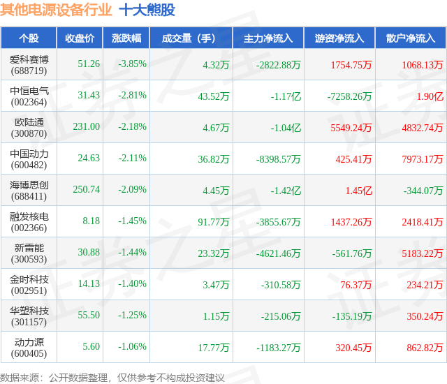 个股表现方面,其他电源设备行业当日领跌股为爱科赛博(688719),该股当日报收51.26,下跌3.85%,成交量4.32万,主力资金净流出2822.88万元。中恒电气(002364)以下跌2.81%紧随其后,该股当日成交量43.52万,主力资金净流出1.17亿元。除此之外,欧陆通(300870)、中国动力(600482)、海博思创(688411)均进入当日熊股之列。具体个股列表见下表: