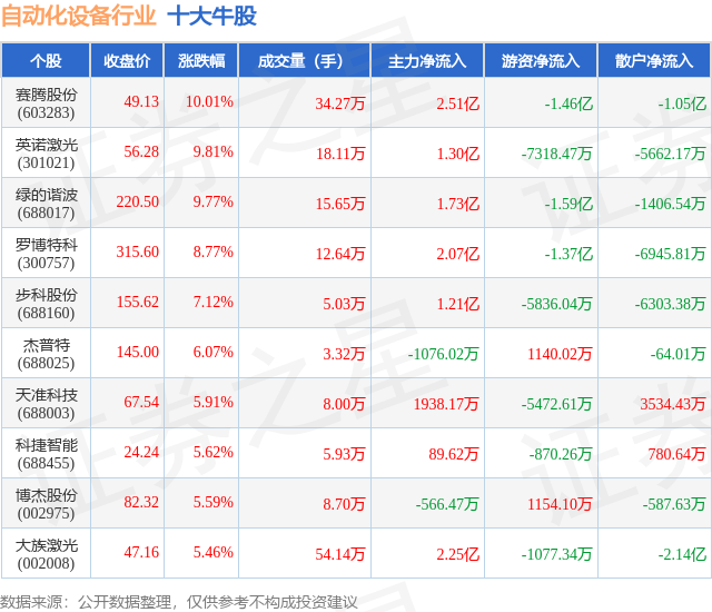 个股表现方面,自动化设备行业当日领涨股为赛腾股份(603283),该股当日报收49.13,上涨10.01%,成交量34.27万,主力资金净流入2.51亿元。英诺激光(301021)以上涨9.81%紧随其后,该股当日成交量18.11万,主力资金净流入1.3亿元。除此之外,绿的谐波(688017)、罗博特科(300757)、步科股份(688160)均进入当日牛股之列。具体个股列表见下表: