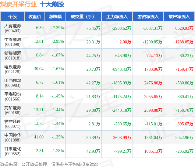 个股表现方面,煤炭开采行业当日领跌股为大有能源(600403),该股当日报收6.39,下跌7.39%,成交量76.45万,主力资金净流出2933.62万元。中煤能源(601898)以下跌2.95%紧随其后,该股当日成交量29.31万,主力资金净流入2.0万元。除此之外,新集能源(601918)、电投能源(002128)、山西焦煤(000983)均进入当日熊股之列。具体个股列表见下表: