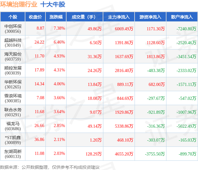 个股表现方面,环境治理行业当日领涨股为中创环保(300056),该股当日报收8.87,上涨7.38%,成交量49.86万,主力资金净流入6069.49万元。超越科技(301049)以上涨6.46%紧随其后,该股当日成交量6.5万,主力资金净流入1391.86万元。除此之外,海天股份(603759)、顺控发展(003039)、华新环保(301265)均进入当日牛股之列。具体个股列表见下表: