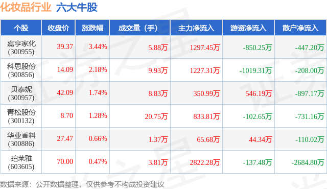 个股表现方面,化妆品行业当日领涨股为嘉亨家化(300955),该股当日报收39.37,上涨3.44%,成交量5.88万,主力资金净流入1297.45万元。科思股份(300856)以上涨2.18%紧随其后,该股当日成交量9.93万,主力资金净流入1227.31万元。除此之外,贝泰妮(300957)、青松股份(300132)、华业香料(300886)均进入当日牛股之列。具体个股列表见下表: