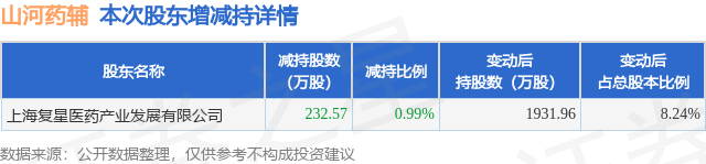 证券之星消息,1月16日山河药辅发布公告《山河药辅:关于持股5%以上股东减持股份达到1%整数倍的公告》,其股东上海复星医药产业发展有限公司于2025年11月24日至2026年1月15日间合计减持232.57万股,占公司目前总股本的0.992%,变动期间该股股价上涨23.17%,截止1月15日收盘报16.85元。