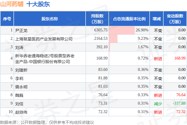 根据山河药辅2025年三季报公布的十大股东详情如下:
