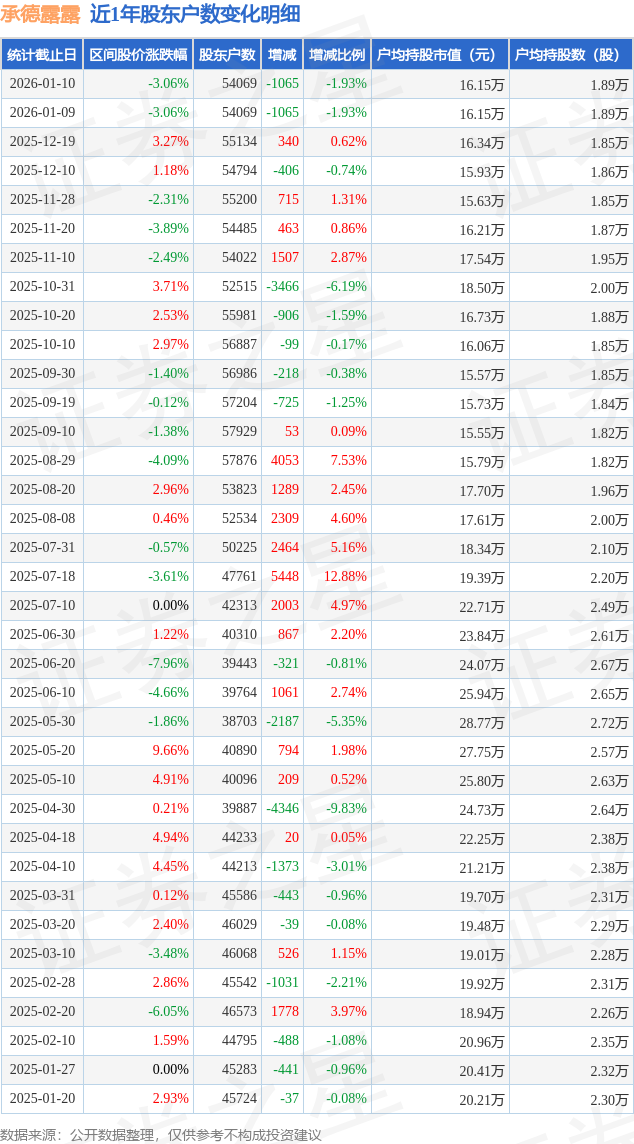 证券之星消息,近日承德露露披露,截至2026年1月10日公司股东户数为5.41万户,较12月20日减少1065.0户,减幅为1.93%。户均持股数量由上期的1.89万股减少至1.89万股,户均持股市值为16.15万元。
