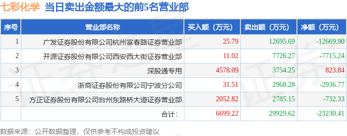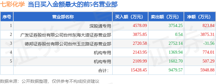 证券之星消息,沪深交易所2026年1月16日公布的交易公开信息显示,七彩化学(300758)因日跌幅达到15%的前5只证券登上龙虎榜。此次是近5个交易日内第2次上榜。