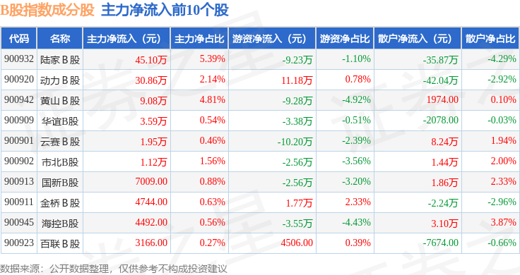 资金流向方面,B股指数(000003)成份股当日主力资金净流入合计11.5万元,游资资金净流出合计188.17万元,散户资金净流入合计176.67万元。成份股资金流向详情见下表: