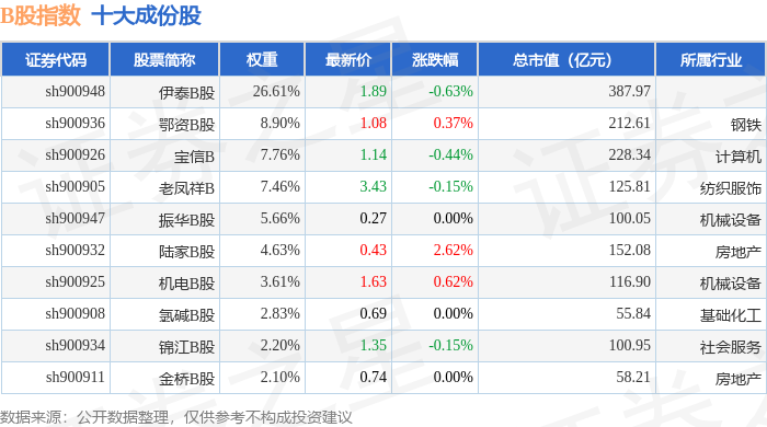 证券之星消息,1月16日,B股指数(000003)报收于259.05点,涨0.03%,成交1.63亿元,换手率0.27%。当日该指数成份股中,上涨的有12家,动力B股以10.0%的涨幅领涨,下跌的有23家,金煤B股以2.76%的跌幅领跌。