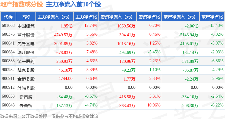 资金流向方面,地产指数(000006)成份股当日主力资金净流出合计196.93万元,游资资金净流入合计1.51亿元,散户资金净流出合计1.49亿元。成份股资金流向详情见下表: