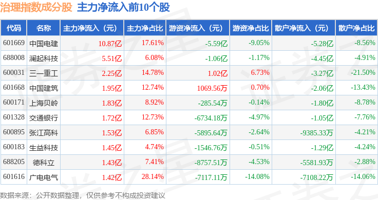 资金流向方面,治理指数(000019)成份股当日主力资金净流出合计94.03亿元,游资资金净流入合计17.47亿元,散户资金净流入合计76.57亿元。成份股资金流向详情见下表: