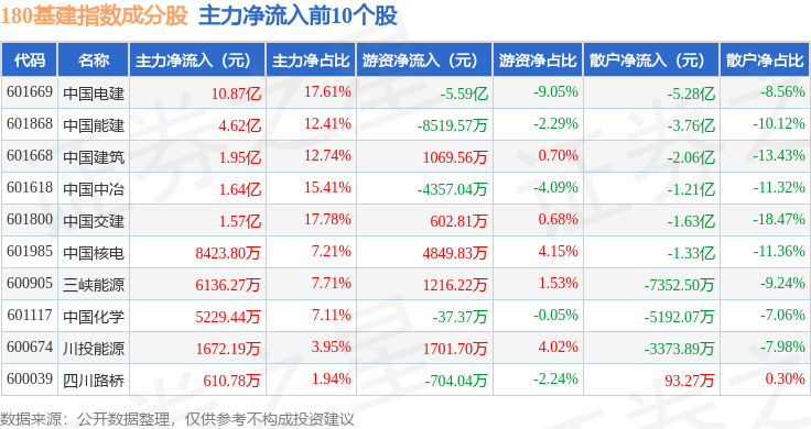 资金流向方面,180基建(000025)指数成份股当日主力资金净流出合计16.44亿元,游资资金净流入合计16.89亿元,散户资金净流出合计4485.68万元。成份股资金流向详情见下表: