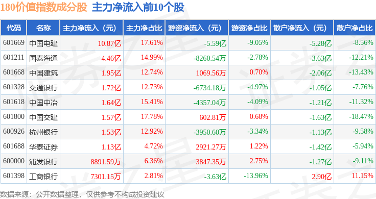 资金流向方面,180价值(000029)指数成份股当日主力资金净流出合计28.68亿元,游资资金净流入合计8.7亿元,散户资金净流入合计19.98亿元。成份股资金流向详情见下表:
