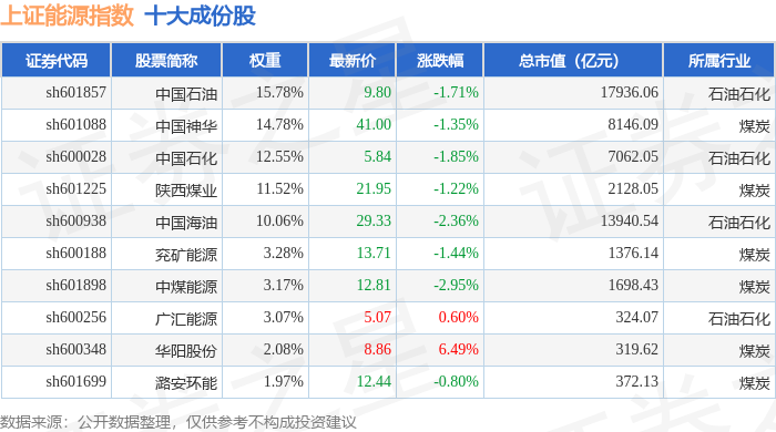 证券之星消息,1月16日,上证能源(000032)指数报收于1957.52点,跌1.57%,成交152.89亿元,换手率0.54%。当日该指数成份股中,上涨的有2家,华阳股份以6.49%的涨幅领涨,下跌的有28家,洲际油气以5.62%的跌幅领跌。