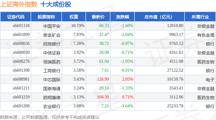 证券之星消息,1月16日,上证海外(000054)指数报收于1619.94点,跌1.2%,成交1477.0亿元,换手率0.52%。当日该指数成份股中,上涨的有10家,中国能建以4.62%的涨幅领涨,下跌的有57家,中国铝业以3.49%的跌幅领跌。