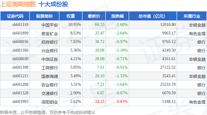 上证周期(000063)指数十大成份股详情如下:
