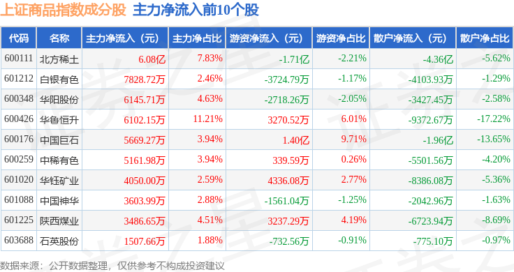 资金流向方面,上证商品(000066)指数成份股当日主力资金净流出合计54.62亿元,游资资金净流入合计17.52亿元,散户资金净流入合计37.1亿元。成份股资金流向详情见下表: