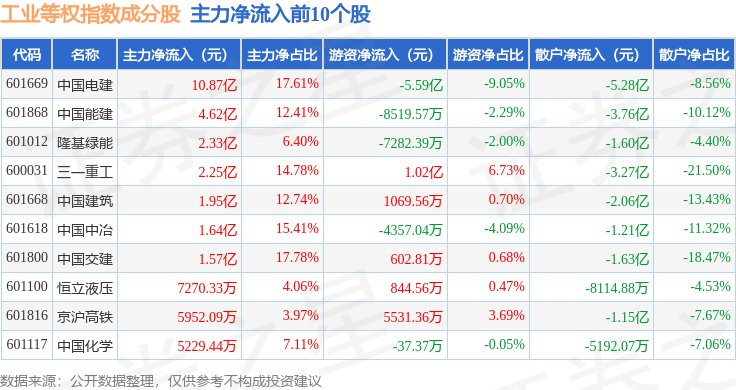资金流向方面,工业等权(000072)指数成份股当日主力资金净流出合计35.87亿元,游资资金净流入合计26.84亿元,散户资金净流入合计9.04亿元。成份股资金流向详情见下表: