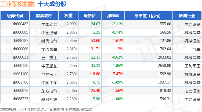 工业等权(000072)指数十大成份股详情如下:
