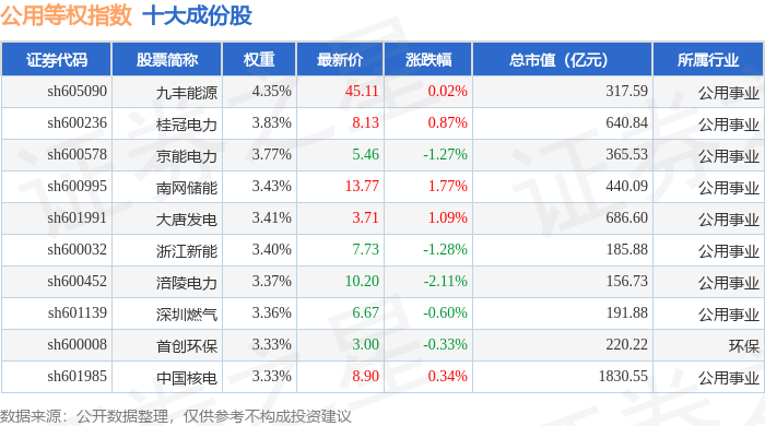 证券之星消息,1月16日,公用等权(000079)指数报收于2582.86点,跌0.14%,成交273.78亿元,换手率1.47%。当日该指数成份股中,上涨的有16家,南网储能以1.77%的涨幅领涨,下跌的有13家,华电新能以3.81%的跌幅领跌。