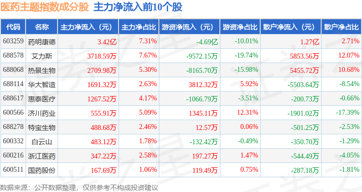 资金流向方面,医药主题(000121)指数成份股当日主力资金净流出合计7.12亿元,游资资金净流出合计4.69亿元,散户资金净流入合计11.82亿元。成份股资金流向详情见下表: