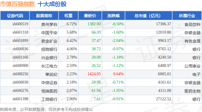 证券之星消息,1月16日,市值百强(000155)指数报收于3362.87点,跌0.59%,成交3641.63亿元,换手率0.73%。当日该指数成份股中,上涨的有27家,长电科技以10.0%的涨幅领涨,下跌的有71家,三六零以5.29%的跌幅领跌。