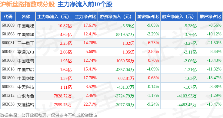 资金流向方面,沪新丝路(000160)指数成份股当日主力资金净流出合计64.72亿元,游资资金净流入合计32.07亿元,散户资金净流入合计32.64亿元。成份股资金流向详情见下表: