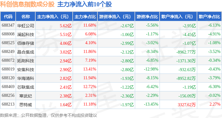 资金流向方面,科创信息(000682)指数成份股当日主力资金净流入合计30.3亿元,游资资金净流出合计23.04亿元,散户资金净流出合计7.27亿元。成份股资金流向详情见下表: