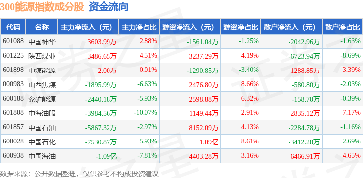 资金流向方面,300能源(000908)指数成份股当日主力资金净流出合计2.55亿元,游资资金净流入合计3.01亿元,散户资金净流出合计4612.57万元。成份股资金流向详情见下表: