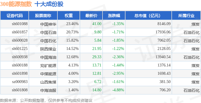 证券之星消息,1月16日,300能源(000908)指数报收于2335.55点,跌1.74%,成交81.36亿元,换手率0.21%。当日该指数成份股中,下跌的有9家,中海油服以4.88%的跌幅领跌。