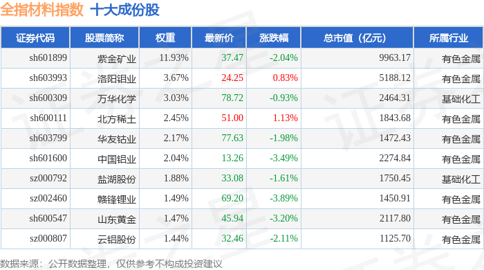 全指材料(000987)指数十大成份股详情如下: