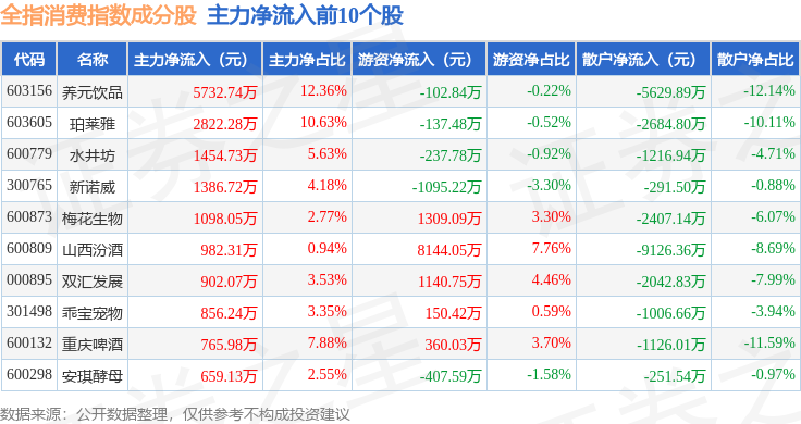资金流向方面,全指消费(000990)指数成份股当日主力资金净流出合计17.53亿元,游资资金净流入合计7.38亿元,散户资金净流入合计10.15亿元。成份股资金流向详情见下表: