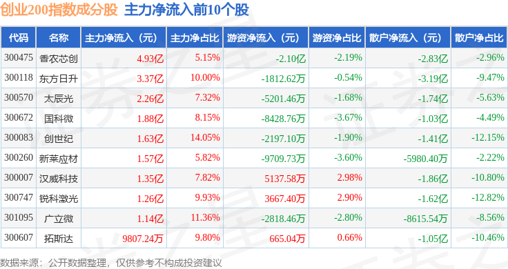 资金流向方面,创业200(399019)指数成份股当日主力资金净流出合计76.43亿元,游资资金净流入合计15.4亿元,散户资金净流入合计61.03亿元。成份股资金流向详情见下表: