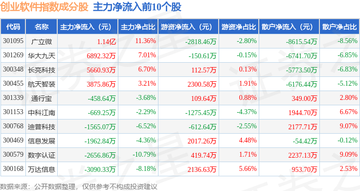 资金流向方面,创业软件(399264)指数成份股当日主力资金净流出合计100.82亿元,游资资金净流入合计19.17亿元,散户资金净流入合计81.65亿元。成份股资金流向详情见下表: